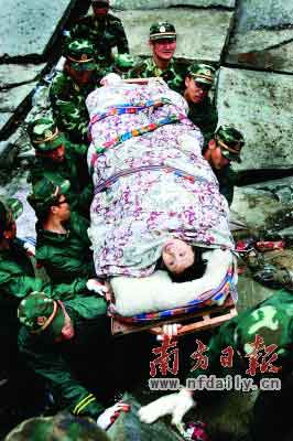 14日上午,汶川特大地震重災(zāi)區(qū)之一的北川縣城,不斷有幸存者從建筑廢墟下獲救,整個(gè)上午,來自四川、重慶、陜西等地的數(shù)十輛救護(hù)車不斷地將獲救者送往鄰近的安縣、綿陽等地的醫(yī)療點(diǎn)醫(yī)治。這些幸存者在建筑廢墟下已堅(jiān)持了40多個(gè)小時(shí),大部分傷勢嚴(yán)重。