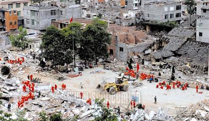 12日14時(shí)28分,平武縣南壩小學(xué),伴隨著巨大的轟鳴聲,地面突然開始劇烈搖晃,文具盒、書本從書桌上彈了下來。孩子們蜂擁著往樓下跑。地面的搖晃愈加劇烈,教學(xué)樓“轟”的一聲全部倒塌,800余名師生無一幸免,全被壓在廢墟下面。此刻,小鎮(zhèn)的房子也成片倒塌,老街的平房瞬間變成一堆廢墟,無數(shù)正在趕場(chǎng)的民眾被破碎的建筑掩埋。一個(gè)常住人口近萬人的小鎮(zhèn),瞬間被夷為平地。