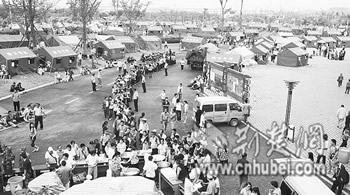 遠遠望去,上千頂帳篷密密地排在體育館四周的草坪和廣場上,體育館主場館外墻上,幾條橫幅醒目地掛著——“相互幫助相互關(guān)心,同船共濟共渡難關(guān)”、“黨和政府永遠和人民心連心”。擴音器里,除了播放尋親的啟事,就是反復(fù)地低唱著“讓世界充滿愛”的歌曲:“輕輕地捧起你的臉,為你把眼淚擦干……”