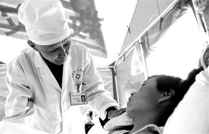 5月13日凌晨5時(shí),什邡市第二人民醫(yī)院1樓臨時(shí)手術(shù)室77歲的主治醫(yī)生張泮林剛做完地震后的第六臺(tái)手術(shù)。此時(shí),一名地震中受重傷的患者被送到了醫(yī)院!翱欤⒓词中g(shù)!”張泮林來(lái)不及休息,立即開(kāi)始為患者做手術(shù)。突然,張泮林倒在了地上,心臟停止了跳動(dòng)。經(jīng)過(guò)全力搶救,1分鐘后,張泮林的心臟才又恢復(fù)了跳動(dòng)。1天不到,身體還沒(méi)有完全恢復(fù)的張泮林,又出現(xiàn)在搶救地震受傷群眾的第一線。