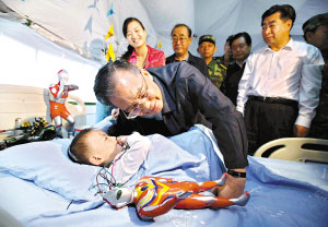 5月23日,溫家寶總理專程到綿陽404醫(yī)院監(jiān)護(hù)室看望了3歲的小郎錚,稱贊他“堅(jiān)強(qiáng)、勇敢”。