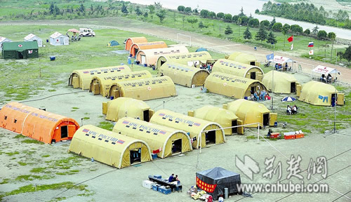 5月24日,汶川大地震后第12天,陽光投射在彭州市職業(yè)中學操場上的20座巨型充氣帳篷上,不時有高鼻深目的“老外”進進出出。