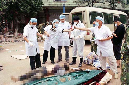 解放軍戰(zhàn)士不懈地挖掘,用雙手搬開(kāi)大大小小的磚頭和石塊似的水泥碎塊,兩臺(tái)大型機(jī)械不停地工作,不時(shí)有遇難者尸體從廢墟中被發(fā)現(xiàn)。戰(zhàn)士們把這些尸體抬到路邊,有人專門(mén)噴灑消毒粉劑,然后我們便為死者清洗面部,以便家屬辨認(rèn),視聽(tīng)技術(shù)人員拍照。無(wú)家屬辨認(rèn)的尸體,我們就從尸體肋部取下一塊軟骨放進(jìn)預(yù)先備好的固定液瓶里編號(hào)保存。挖出的尸體大多數(shù)都已變形,有的肢體殘缺,腐爛嚴(yán)重,操作者不得不戴上防毒口罩。