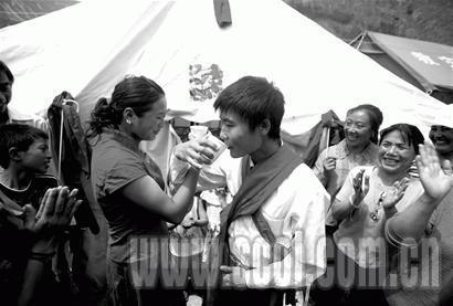 “親一個,親一個!”在滔滔的岷江邊,在凌亂的廢墟旁,在簡單的帳篷里,這樣的聲音對遭遇特大地震災(zāi)害后的汶川而言,顯得久違而珍貴。正是在這個重災(zāi)區(qū),在鄉(xiāng)親們熱情的呼喊中,昨日上午,汶川縣威州鎮(zhèn)雙河村的一對年輕羌族戀人攜手走進婚姻殿堂,為這個劫后重生的地方增添了一些喜氣。