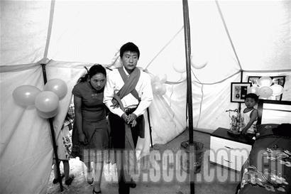既然要結(jié)婚,就應(yīng)有一頂帳篷作洞房。王小波所在雙河村黃巖組的干部5月31日趕緊去找?guī)づ。但找來找去,最后只找到一頂白色帳篷?/p>