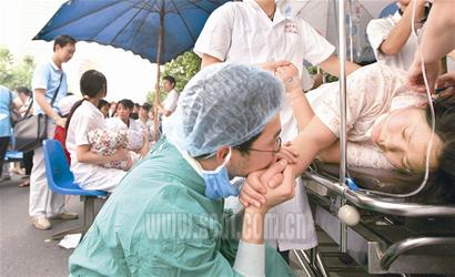 市民們和醫(yī)生心手相連的場面打動了每一位路人,也刺激著我的快門不停響動。透過人群中的縫隙,一幕畫面深深地打動了我的心靈,只見一位身穿手術(shù)服,頭戴消毒帽的年輕男子正蹲在一臺擔(dān)架車旁,握著一位虛弱的產(chǎn)婦的手,無言地對視著,他們正等待著小生命的降臨。突然,男子將她的手放在唇邊,輕輕一吻,就像在說:老婆,你不要怕,一定不會有事,我們的孩子會平安降生。按動快門的同時(shí),淚水滑過我的眼眶。