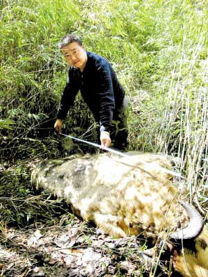 唐家河國家級自然保護區(qū)管理處副處長鮮方海拿出一疊照片說:“僅僅在交通恢復(fù)的林區(qū)邊緣地帶,就發(fā)現(xiàn)了國家一級保護動物牛羚死亡了兩頭,都是滑坡被砸死的!庇捎诨聡乐,目前無法進入山林的腹心地帶,他們僅在林區(qū)邊沿地帶搜索動物的行蹤,就發(fā)現(xiàn)了牛羚、金雕、野山羊等至少15具動物的尸體,其中大部分是國家保護類動物。
