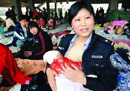 地震發(fā)生后,被轉移來的嬰兒除了可以喝一點水和稀飯外,沒有其他東西可吃!按笕诉可以餓、還可以忍,而這些小嬰兒卻不能餓、不能忍!作為母親,我覺得這些孩子太可憐了。正好我還在哺乳期,就讓我來給他們喂奶吧!”在受災群眾安置點協(xié)助工作的29歲民警蔣曉娟提出:我去給這些嬰兒哺乳!