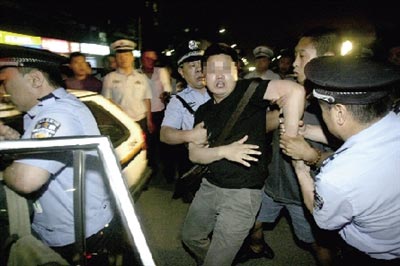 阻礙執(zhí)法的民警被帶上警車。本報(bào)記者 董世彪 攝