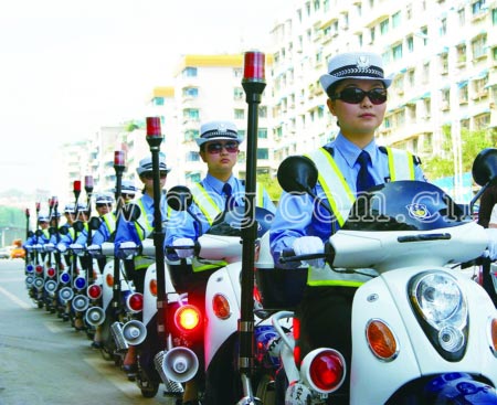 每當(dāng)這些漂亮的女交警隊員騎著警用摩托車在城區(qū)巡邏,或是在各個路段執(zhí)勤時,人們都會投去贊美的目光。如今,英姿颯爽的首支女子交警隊,已成為畢節(jié)城區(qū)一道亮麗的風(fēng)景。 (貴州都市報 朱光倫)