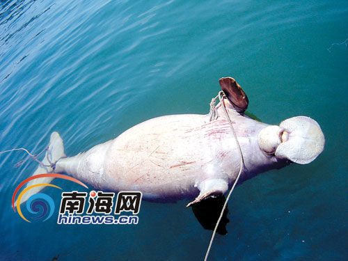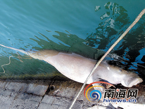 23日上午,記者在東郊椰林旅游碼頭海邊見到了這條已經(jīng)死亡的“怪魚”。東郊鎮(zhèn)政府的相關(guān)工作人員已經(jīng)趕到現(xiàn)場(chǎng)。這條魚軀體龐大,長(zhǎng)3米,全身呈灰白色,重約1000斤。與其他魚不同的是,這條魚的頭部,尤其是嘴巴和豬特別相像,嘴巴上唇還長(zhǎng)滿了堅(jiān)硬的“胡須”。前往現(xiàn)場(chǎng)圍觀的村民們告訴記者,他們從來(lái)沒有見過這種魚,因?yàn)樗念^很像豬頭,大家都稱它“豬頭”魚,或者“海豬”。