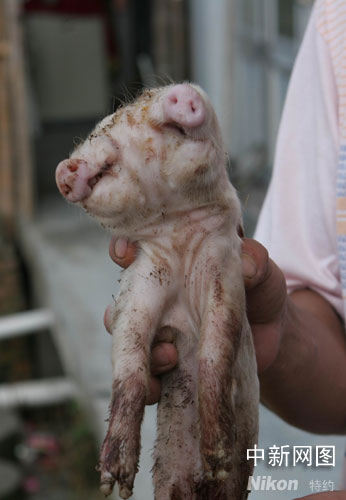 據(jù)悉,在7月21日的時(shí)候,陳仙福家飼養(yǎng)的一頭母豬開始下崽!爱(dāng)天上午一共生了3只,2只白色的,1只是黑色的,都很正常和健康。最后一只是拖到當(dāng)天下午3點(diǎn)半左右才生下來(lái)的,結(jié)果生出來(lái)的最后一只小豬嚇了我們一大跳。”陳仙福說(shuō),“這只豬站立不起來(lái),也不吃東西,長(zhǎng)著兩只腦袋,腦袋上各長(zhǎng)著獨(dú)立的嘴巴和鼻子,卻共享一雙眼睛和一對(duì)耳朵!标愊筛1硎荆依镫m然養(yǎng)過(guò)十幾年的豬,但像這樣奇形怪狀的豬崽還是頭一次碰見。