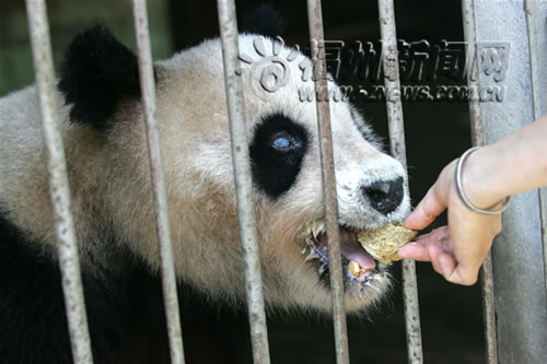陳玉村介紹,“07”號大熊貓的檢查報告讓人們對它的健康狀況更加擔憂,“專家可能先給它作眼科手術(shù),目前我們先治它的眼睛潰瘍,之后,分別給它的眼睛動手術(shù)。現(xiàn)在正用中藥對它進行先期治療,把中藥燉成湯,讓它當水喝。因為有藥味,它經(jīng)常不喝,工作人員就在里面放點它喜歡吃的食物哄它喝一點”。