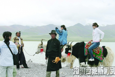 進(jìn)藏游客騎著牦牛在“天湖”納木錯邊留影。