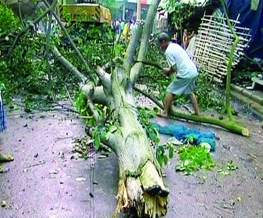 狂風(fēng)暴雨之后,人們在清理倒在道路中的樹。