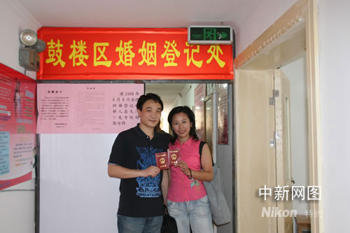 穿著一身鮮紅色情侶裝的許小姐和王先生,在人群里特別顯眼,許小姐調(diào)皮的說:要的就是這個效果,領(lǐng)證么就要喜慶點。