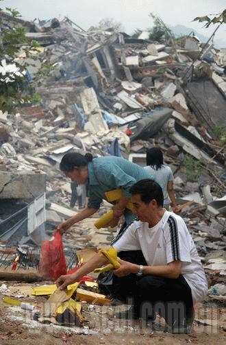 廖女士沿著兒子的上學(xué)路線走著,但哪兒還有路啊?都是一片廢墟。一塊“北川羌族自治縣惠農(nóng)服務(wù)中心”的牌子立在一塊空地上,它的后面,是一堆建筑垃圾!扒懊媸轻t(yī)院,醫(yī)院旁邊是幼兒園!贝┻^曲山街,廖女士爬上了廢墟,艱難地走著,然后,在一個(gè)小平臺(tái)處停了下來,擺放好大花束,將紙錢點(diǎn)燃!皨寢寔砜茨懔恕阋浀没貋砜磱寢,我等你,聽到?jīng)]有,嗯?”雨水和淚水打濕了她的臉。