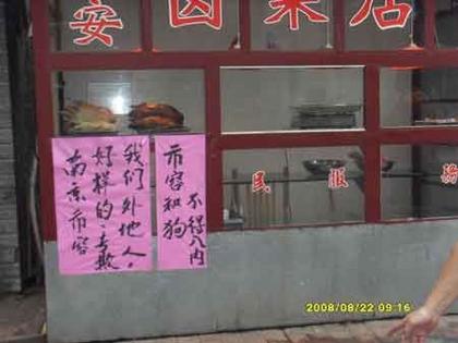 記者發(fā)現(xiàn),這個帖子已被不少網(wǎng)站轉(zhuǎn)載,照片上顯示,一家有“鹵菜店”字樣的櫥窗下貼著一大一小兩張標(biāo)語,上面分別用毛筆寫著“南京市容好樣的,專欺我們外地人”和“市容和狗不得入內(nèi)”。照片上還有拍攝日期,為“2008年8月22日上午9點16分”。