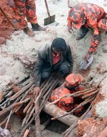 求救的男子撲通一聲跪倒在地,淚水瞬間打濕了面頰;協(xié)助救援的村民們也都紛紛捂著臉,退向外圍;文偉、薛紅兵、鐘銀和劉小威低下頭,悄悄抹去眼淚,“干了這么多年救援,就從沒見過這樣的場面。”為了不傷害母女倆的遺體,4個人把鋤頭、鐵鍬等全部扔了出去,改為徒手挖掘,“每一秒鐘,我都有一種想跪倒的感覺,我們所面對的,已不是她們的遺體,而是偉大的母愛!