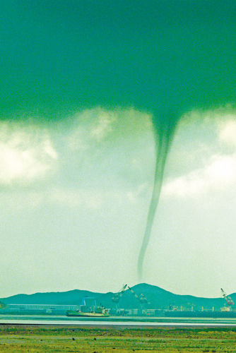 “太壯觀了!龍卷風(fēng)在海面上吸起500多米高的水柱,一時間水柱和天上的烏云連接在一起!钡谝淮慰吹健褒埼逼嬗^的虞先生在電話中依然顯得特別興奮。昨天上午10時20分左右,在定海區(qū)馬岙鎮(zhèn)上班的虞先生,遠遠看到岱山縣秀山常石集團附近有一片烏云。不一會兒,烏云中忽然伸出一條黑色水柱,直指海面。隨后,水柱越來越粗,并且略微移動。當時他意識到,這應(yīng)該是龍卷風(fēng)了,也就是傳說中的“龍吸水”!整個過程大概持續(xù)了10分鐘不到,之后烏云就散去了。
