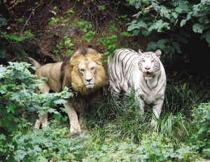 據(jù)了解,獅虎獸的父母是一只雄性非洲獅和雌性孟加拉白虎“小雪”,都是2002年在紅山動物園出生的,一起生活在“獅虎生態(tài)園”,感情很好。當(dāng)初跟它們一起關(guān)進(jìn)園里的還有另外五只猛獸,包括兩只母獅,一公一母兩只虎,以及一只母白虎?墒沁@只雄性非洲獅就是喜歡跟“小雪”待在一起,對自己的同類——兩只母非洲獅反倒不理不睬。后來,工作人員先后移出了兩獅兩虎,園里只留下“小雪”、雄性非洲獅,和一只母東北虎。園子里“太平”了,“小雪”跟它的獅“哥”更是形影不離,親密不已,那只母東北虎成了“電燈泡”。