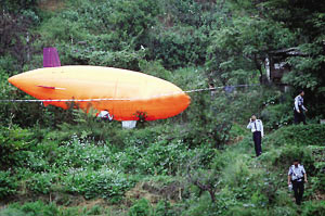 25日下午3點,岷山昆明制藥廠內,一“不明飛行物”突然闖入,降落在半山腰上,周圍近百住戶上山圍觀,一些人以為是UFO,數輛警車載著近30名警察趕到現場。其實,“不明飛行物”只是一艘普通的飛艇,是某航模公司與某火電廠架設高空電線用的,因為下雨,遙控器失靈,發(fā)動機停止工作,最后落了下來。(據都市時報)