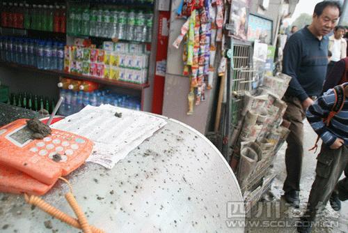 記者在現(xiàn)場(chǎng)看到,人民北路一段25號(hào)外,路面全濕,泥漿滿地。離出事現(xiàn)場(chǎng)最近的成都巖礦測(cè)試中心臨街的宿舍,1-6樓墻體污漬斑斑。距離被挖爆管道只有兩米距離的成偉干雜店,門(mén)口還沒(méi)有賣(mài)完的報(bào)紙上全是泥漿,玻璃櫥窗上污漬斑斑,大小石塊、泥土到處都是。