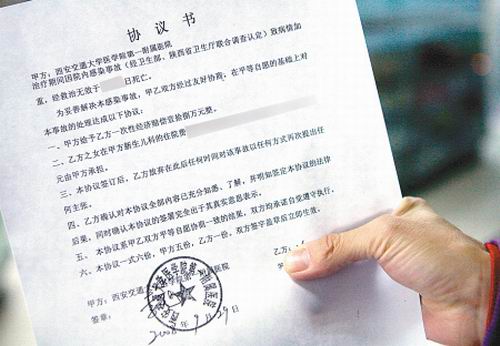 記者從一位家長手中拿到了這份協(xié)議書。協(xié)議書的甲方為西安交通大學醫(yī)學院第一附屬醫(yī)院,乙方為患兒家屬。協(xié)議書的內(nèi)容如下: