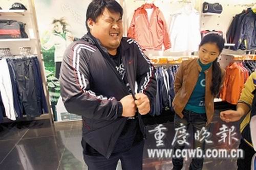 普通衣服不行,寬大的運(yùn)動(dòng)服或許可以!在記者建議下,王杰來(lái)到南坪步行街的某運(yùn)動(dòng)專賣店,店長(zhǎng)拿出該店最大的4XL特大裝,王杰連袖管都不能自主穿進(jìn)去,后在眾人協(xié)助下勉強(qiáng)穿上身,卻像成年人穿童裝,明顯不合身。