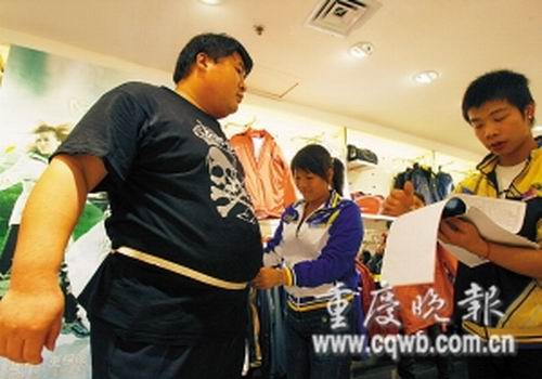 “老板,有適合我穿的衣服沒?”昨下午,王杰抱著最后一絲希望來(lái)到南坪步行街,見到賣衣服的店就問。售貨員們先是一陣驚愕,隨即頭搖得像撥浪鼓。這已是王杰第5天專程上街買衣服了,他先后跑遍了朝天門、解放碑、觀音橋、沙坪壩、楊家坪,都無(wú)功而返,至今還穿著從老家?guī)?lái)的、定制的單衣褲,陣陣秋風(fēng)吹得他瑟瑟發(fā)抖。