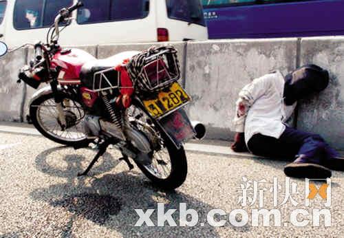 劫匪駕車高速轉(zhuǎn)入南海大道時,與路過的車輛發(fā)生碰撞失控倒地,劫匪欲翻越護(hù)欄逃跑時被民警阿偉抓獲。