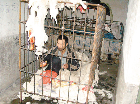 該村村民告訴記者,今年37歲的薛建倉(cāng)在17歲時(shí)遭遇搶劫受到強(qiáng)烈刺激,患上精神分裂癥,十多年前其父因病去世,母親半身不遂臥病在床,薛建倉(cāng)現(xiàn)由他的大姐照顧。2006年6月,薛建倉(cāng)病發(fā)時(shí)將叔叔砍死,今年8月份,他又發(fā)病,一把火將自家房屋燒毀。由于發(fā)病時(shí)的薛建倉(cāng)極具攻擊性,曾多次襲擊附近村民,并揚(yáng)言要?dú)⑷耍瑸榱巳迦说陌踩,村民與薛建倉(cāng)的姐夫董選斌商量,在沒(méi)有想出好辦法之前,將薛建倉(cāng)用鐵籠囚禁了起來(lái)。這個(gè)鋼筋焊成的鐵籠長(zhǎng)2米,寬1米,高約1.4米,一堆破碎的棉絮散落在籠內(nèi),薛建倉(cāng)吃住就在其中。