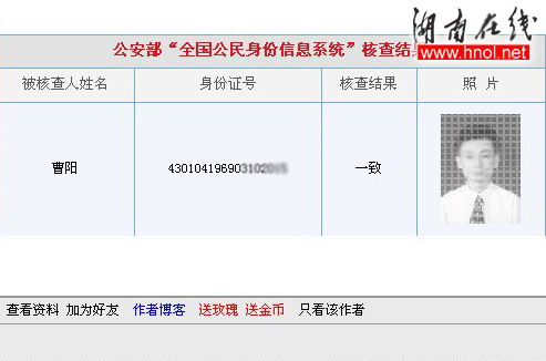 不少網(wǎng)友根據(jù)已有信息開展“人肉搜索”,據(jù)網(wǎng)友“追尋者”提供的信息顯示,該男子系岳陽市人大代表,69年出生,名叫曹陽。一名網(wǎng)友更利用公安部新近開通的“全國公民身份信息系統(tǒng)”將曹姓男子的身份證照片搜索出來并貼到網(wǎng)上。還有山東棗莊的網(wǎng)友提供了嫌疑男子的手機號碼及詳細住址,網(wǎng)友半信半疑,有網(wǎng)友更是試圖撥打號碼,但無法接通。