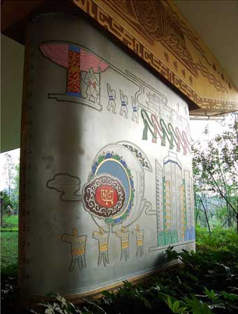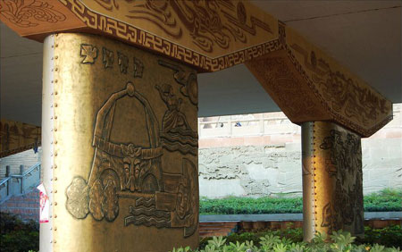 據(jù)有知情網(wǎng)友透露,這座“史上最牛的橋墩”來自四川德陽市鼓樓下的成綿高速高架橋橋墩。橫亙在鼓樓與廣場之間的高速公路橋墩,成了設(shè)計者發(fā)揮想象的地方。設(shè)計者將28個橋墩進行裝飾改造,以仿古浮雕銅板扣畫和仿敲銀浮雕扣版畫及大型仿烙鐵裝飾畫體現(xiàn)德陽6縣(市、區(qū))歷史文化、風景名勝、人文景觀及重裝基地風采。整個壁畫長廊立體感極強,既抽象又寫實,色彩明朗,極具現(xiàn)代藝術(shù)風格。彩虹橋、石刻、白馬關(guān)、龐統(tǒng)墓、倉山大樂、黃繼光紀念館、三星堆、年畫館、劍南春……德陽的標志一一在此得以展現(xiàn),每個篇章把歷史文化、風景名勝、人文景觀融為一體,形成一個完整的壁畫群落,壁畫面積達2309平方米,是整個德陽地區(qū)景點的微縮!笆飞献钆5臉蚨铡庇2007年初推出,并受到當?shù)仡I(lǐng)導的表揚。