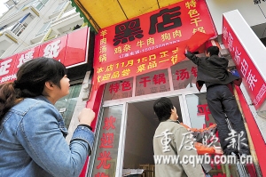“取這樣的名字就是為了吸引眼球,其他沒啥特別的意義。”餐館老板楊宗寶稱。今年25歲的楊宗寶是合川區(qū)人,以前打工為生,最近才和好友合伙開此湯鍋店!盀榱巳特別的名字,我們想了四五天!睏钭趯毞Q,他經(jīng)常玩網(wǎng)絡(luò)游戲“魔獸爭霸”,游戲里把特別厲害的戰(zhàn)隊稱為“黑店”,左思右想后,他決定把“黑店”復(fù)制到自己的餐館身上。“這不,餐館明天才開業(yè),不過招牌掛出來就吸引了不少人氣。”他得意地說,沒聽有人說啥不好的。