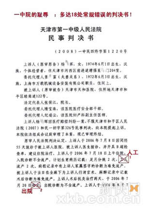 一篇名為《天津某法院多達18處低級錯誤的終審判決書》出現(xiàn)在某論壇上。一位網(wǎng)名是“哭泣不是懦弱”的發(fā)帖人在帖子中寫道:“這是我2008年11月7日領(lǐng)到的法院終審判決書。一份僅6頁的判決書,光錯別字、丟字等低級錯誤就有18處。這樣一份錯誤百出的終審民事判決書還赫然蓋上了"××法院"的公章。難道法官就是這樣的工作態(tài)度嗎?法律的權(quán)威與神圣蕩然無存!”