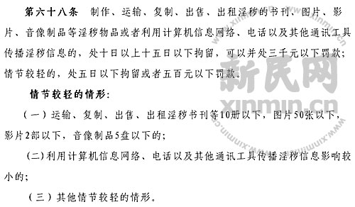 根據(jù)該局今日公布的《標(biāo)準(zhǔn)》第六十八條之規(guī)定:制作、運(yùn)輸、復(fù)制、出售、出租淫穢的書刊、圖片、影片、音像制品等淫穢物品,或者利用計(jì)算機(jī)信息網(wǎng)絡(luò)、電話以及其他通訊工具傳播淫穢信息的,處十日以上十五日以下拘留,可以并處三千元以下罰款;情節(jié)較輕的,處五日以下拘留或者五百元以下罰款。其中并沒有媒體所說的“3次”限制。