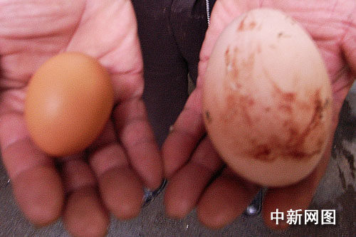 “巨無霸”雞蛋對(duì)比普通雞蛋。作者:余麗軍
