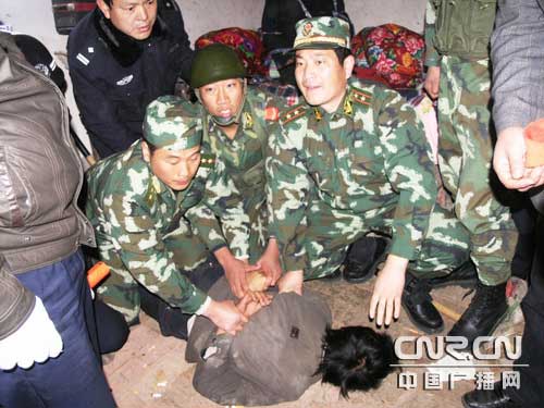 20時(shí)20分,案犯又要求其母送打火機(jī)吸煙。20時(shí)22分,在聯(lián)指授意下,其母讓案犯開(kāi)了燈,并告之家里沒(méi)有任何人,案犯放松警覺(jué),準(zhǔn)備開(kāi)門出來(lái)。盧參謀長(zhǎng)示意突擊組做好突擊準(zhǔn)備,在案犯開(kāi)門一剎那,孫參謀一手用強(qiáng)光疝氣燈照住案犯雙眼,趁案犯尚未反應(yīng)過(guò)來(lái),一手持應(yīng)急棍將案犯打倒在地,參戰(zhàn)官兵迅速將其生擒并帶離現(xiàn)場(chǎng)。
