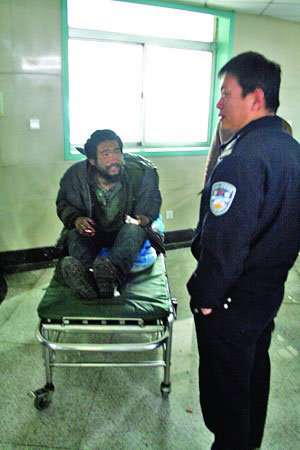 下午4點(diǎn),濟(jì)南市中心醫(yī)院急診大廳,一名滿臉胡子、衣著破舊的男子坐在擔(dān)架上!拔沂莵砜床〉,放開我”,雙腳還被繃帶束縛著的他搖頭晃腦,“我喝酒了,我做錯(cuò)了,我給你們磕頭”。
