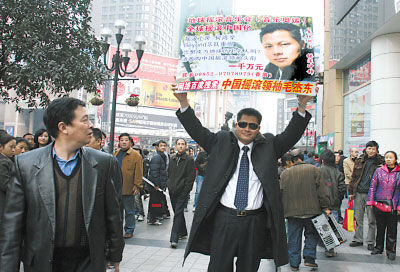昨天下午4時許,記者在解放碑步行街看到,該男子舉著一塊長1米,寬0.5米的廣告牌在游走,衣著及外形模仿周潤發(fā)在電影《英雄本色》中扮演的“小馬哥”。牌子上大致內容是:“中國搖滾領袖舉辦搖滾音樂會,如果你想成名,請收購中國搖滾領袖頭銜,一千萬”。他以這身行頭出現(xiàn)引來上百人圍觀,甚至有市民以為在拍電影,上前與他握手!八褪巧洗握髑f富婆的那個人!辈糠质忻裾J出了這名男子正是幾個月前曾在解放碑征千萬富婆結婚的“征婚狂人”廣西人毛杰東。毛先生表示,想憑自己酷似發(fā)哥的外形,通過征婚獲得資金發(fā)展搖滾事業(yè),雖沒成功,但他熱愛搖滾的熱情還未減退,這次想在解放碑拍賣自己“搖滾領袖”的頭銜,也就是拍賣自己。如果有人愿意拿出1000萬或500萬來投資,他就可以組辦搖滾演唱會,并將繼續(xù)曾經(jīng)的征婚路線,到各大城市宣傳自己,下一站將到成都。下午6時許,經(jīng)保安人員多次勸解、警告,毛杰東才離開步行街。