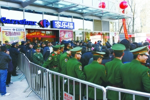 昨天上午10點(diǎn)左右,記者看到家樂(lè)福超市大門(mén)緊閉,門(mén)兩側(cè)各貼了一張解釋未能如期開(kāi)張的告示。門(mén)前的圍欄里,一些工作人員正在向不斷趕到的顧客解釋關(guān)門(mén)原因。
