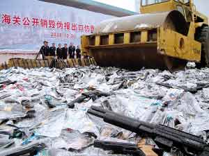 據(jù)了解,這批仿真槍是廣東省海關(guān)系統(tǒng)近年來查獲的最大一宗走私仿真槍案。2006年4月5日,深圳市祥鵬達貿(mào)易有限公司以一般貿(mào)易方式向汕頭海關(guān)申報出口塑料玩具469箱,共62468個,凈重11032公斤。經(jīng)海關(guān)查驗確認,其中的310箱申報為塑料玩具(軟彈槍)的貨物實際為仿真槍43款共42762支,申報貨物與實際不符。經(jīng)鑒定,該批貨物分別與美國產(chǎn)“航空曲尺”、“M9”、“格魯GP-100左輪”等軍用手槍近似;與美國產(chǎn)“MP5K-PDW”、匈牙利產(chǎn)“NGM”等沖鋒槍、步槍近似,均為仿真槍。(本報記者 楊媛 通訊員 岱芬 純潔 曉潔 攝影報道)