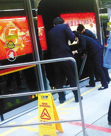 記者隨后在農(nóng)講所地鐵站臺看到,破裂的是第14和15道門。由于工作人員反應(yīng)較快,地面破碎的玻璃片已清理得一干二凈,地鐵也恢復(fù)正常通車。破碎玻璃墻外被鐵欄桿牢牢圍住,以防止因乘客擁擠而掉入地鐵軌道。兩扇出入地鐵列車的門已被封閉,禁止乘客出入。欄桿旁邊有工作人員在為落站的乘客指引乘車路線。