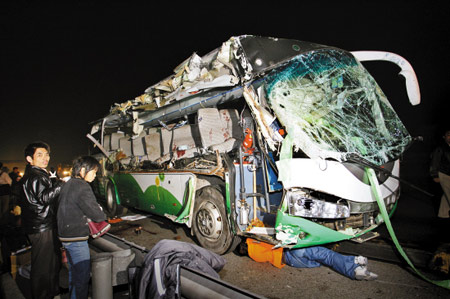 晚上10時(shí)許記者趕到現(xiàn)場時(shí),見到一輛車號為贛A16230的大客車停靠在高速公路慢車道上,車身右側(cè)殘破不堪———車門被擠扁,車輪以上的車身外殼已被完全刮掉,右側(cè)前六排座椅皆扭曲變形,上面沾滿血跡。地面上有多處大攤血跡,散落的乘客物品隨處可見。