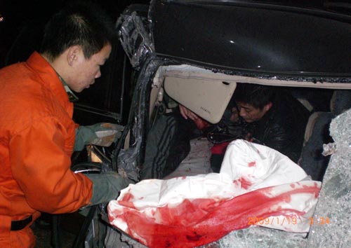 凌晨3時14分,接到報警后,漯河源匯區(qū)消防大隊特勤中隊中隊長彭中明立刻帶領(lǐng)一部搶險救援車10余名隊員火速趕往事故現(xiàn)場。距離現(xiàn)場50米外,就能看到一列長長的火車停在南環(huán)路中間,把進入漯河市區(qū)內(nèi)的幾條主要通道牢牢堵死,造成進出漯河的幾輛汽車無法通行。來到事故現(xiàn)場,只見一輛小轎車的車頭被撞得面目全非,擋風(fēng)玻璃被撞碎,車前的引擎蓋被撞得凸了出來,一名40多歲的司機滿臉是血,嘴里不停地發(fā)出微弱的呻吟聲。由于他的雙腳被卡在變形的車體內(nèi),現(xiàn)場的交警經(jīng)過多次努力最終沒能將其救出。