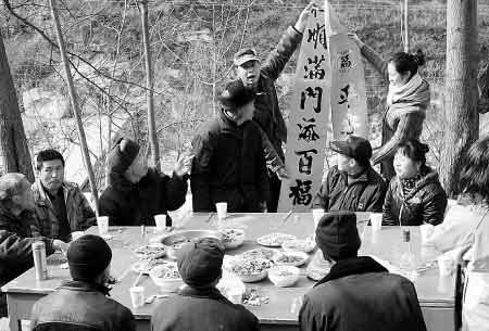 這一桌豐盛的酒菜,是常年在長安區(qū)大峪口龍石溝利用業(yè)余時間義務(wù)植樹造林的郭建民一家精心準(zhǔn)備的,專門宴請龍石溝的15戶村民一同提前吃年夜飯。
