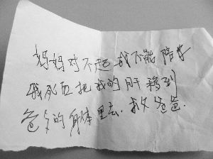令崔女士怎么也沒有想到是,1月24日中午12點(diǎn)半左右,當(dāng)她從醫(yī)院回到家,卻發(fā)現(xiàn)自家的大門被反鎖了,“我只好從后院翻墻進(jìn)去,看到我女兒躺在床上一動不動,就像死了,旁邊有兩個(gè)安眠藥空瓶和一張遺書,上面寫著‘媽媽對不起,我不能陪你,我死后把我的肝移到爸爸的身體里去,救爸爸!贝夼款D時(shí)覺得天旋地轉(zhuǎn),“這兩瓶安眠藥有200粒。∨畠菏23日傍晚五點(diǎn)多在醫(yī)院吃過晚飯回家的,到我發(fā)現(xiàn)的時(shí)候,有十多個(gè)小時(shí)了!
