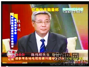 在一家電視臺(tái)播出的億康納米能量杯廣告中,一位學(xué)者打扮的人端坐當(dāng)中,文字顯示,“專(zhuān)家”名叫陳偉明,是中國(guó)醫(yī)促健康飲水協(xié)會(huì)理事。而在另一幅華佗延壽酒的廣告視頻截圖中,容貌一樣,甚至連領(lǐng)帶圖案都一樣的“陳偉明”,“搖身一變”卻成了“關(guān)新良”,身份也變成《北京中醫(yī)》雜志編委、中國(guó)中西醫(yī)結(jié)合協(xié)會(huì)理事、北京中日友好醫(yī)院主任醫(yī)師。