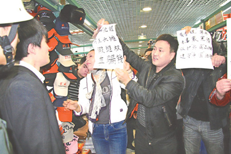 2月8日上午9點(diǎn)半,北京秀水街市場(chǎng)有限公司依據(jù)北京英特普羅知識(shí)產(chǎn)權(quán)代理有限公司向其提供的一份公證書(shū),以涉嫌售假為名,準(zhǔn)備對(duì)市場(chǎng)內(nèi)的7家商戶進(jìn)行封攤處罰。但在場(chǎng)商戶卻手持公證處的一份“證明”,強(qiáng)烈質(zhì)疑英特普羅代理公司出具的售假公證存在“證據(jù)不足”,并與市場(chǎng)管理人員和保安發(fā)生沖突。